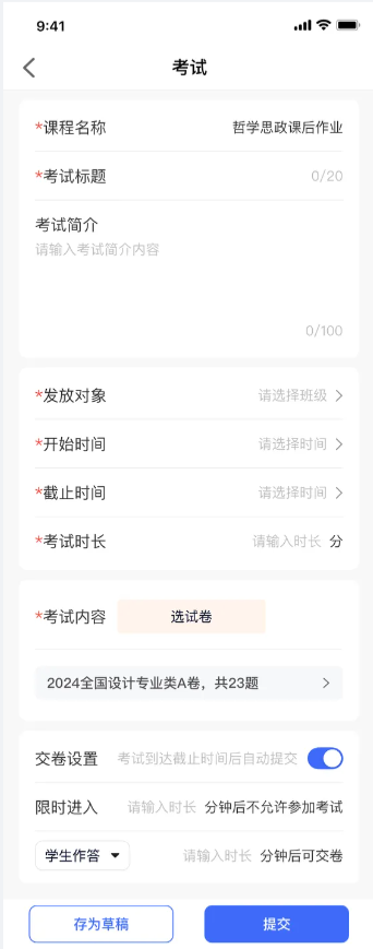 新建考试;填写考试标题,设置开始时间和截止时间,选择考试的班级,设置考试时长、限时进入、交卷设置、限制提交,选择试卷;发布后学生即可看到此考试。
