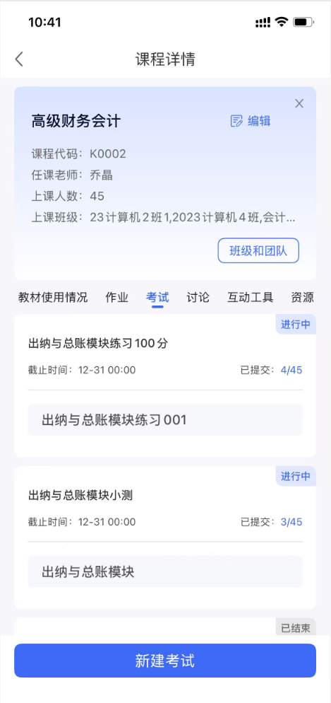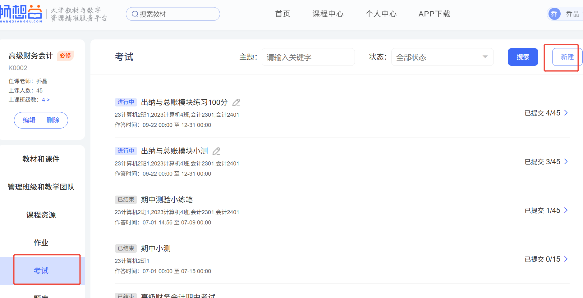 2.课程详情点击考试-点击【新建】按钮