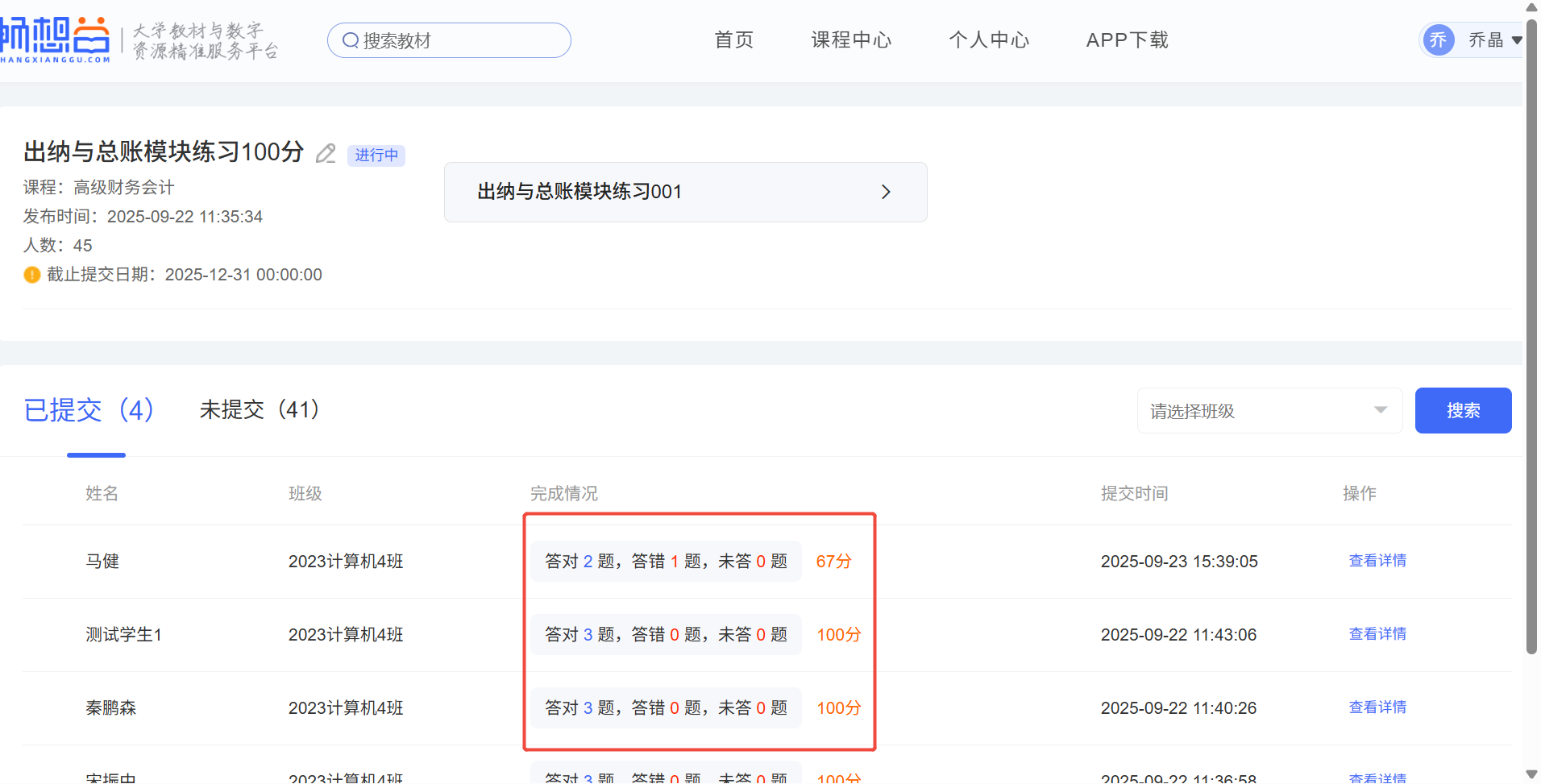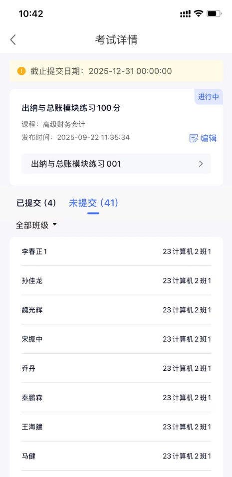 老师可查看该考试的提交和未提交情况,