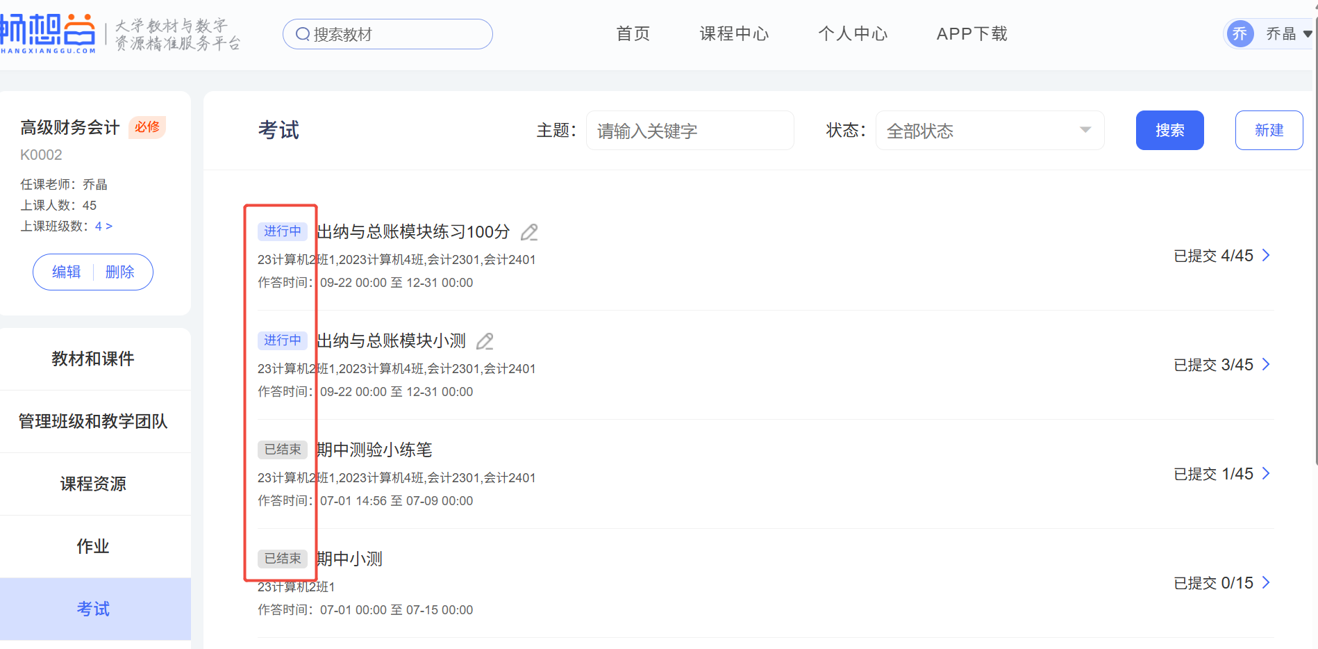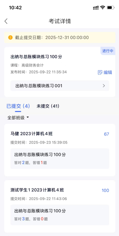 (2)进行中状态的考试学生可进行提交,老师可提前结束