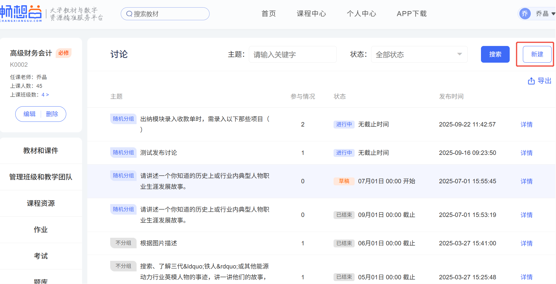1、老师端-【课程中心】-讨论-点击【新建讨论】按钮;