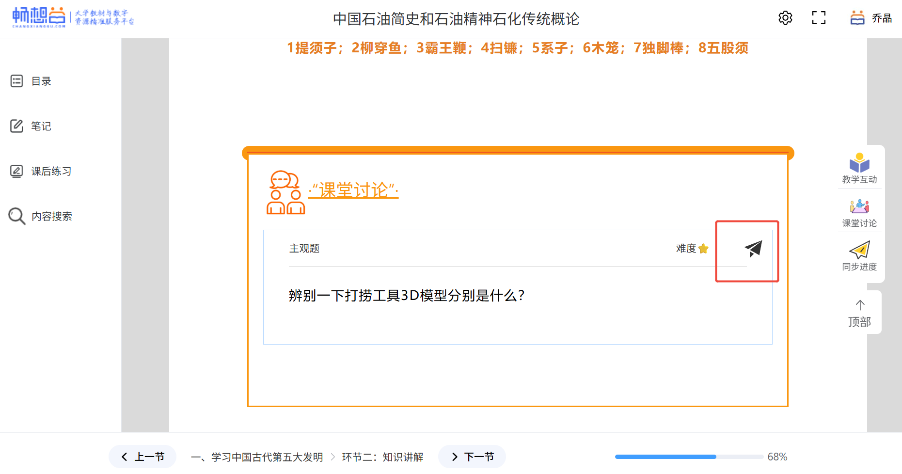 在畅想谷粒平台“课程中心”中,讨论是一种检验数字教材学习成果和课后分组讨论练习的工具。老师可在发起讨论,学生在讨论结束前进行答题,老师发起讨论后,学生会收到讨论,老师可设置分组讨论组长或不分组讨论,并设置组长提交或全部学生提交;老师可设置随机分组或自由分组学生可根据老师设置进行分组;按照老师的设置进行提交,提交后老师可对提交情况进行评分;同学之前可进行点赞。