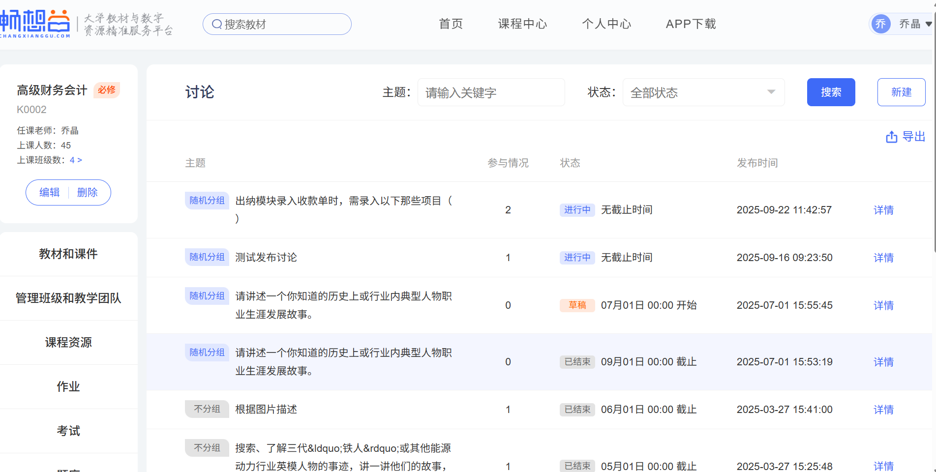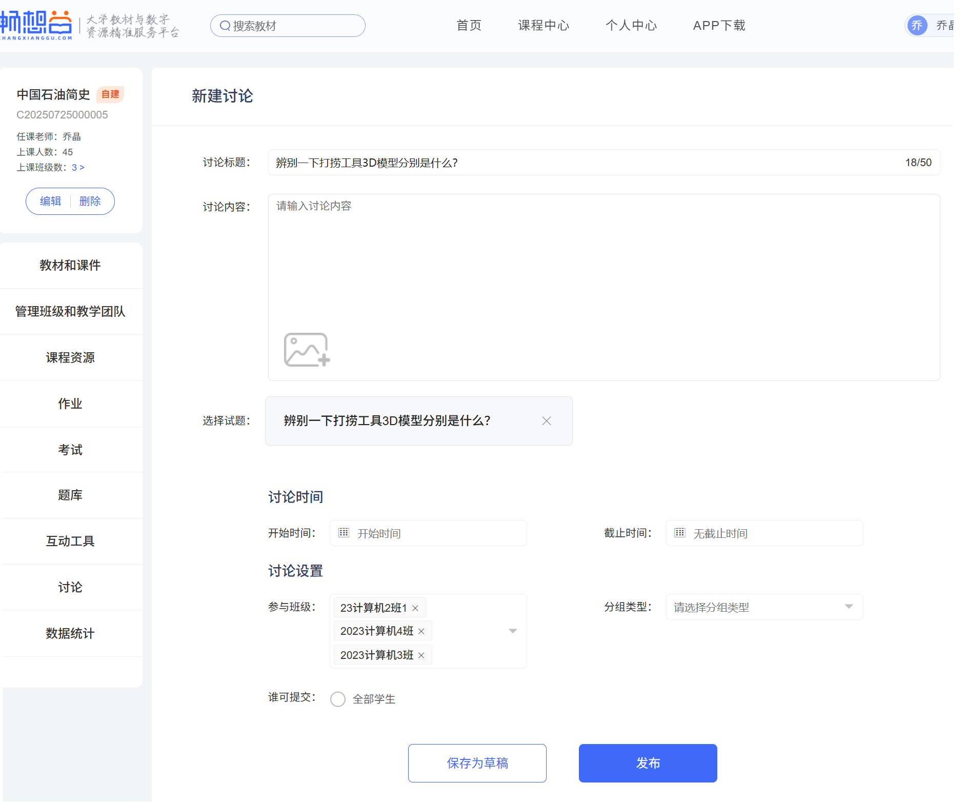 1、老师端-【课程中心】-讨论-点击【新建讨论】按钮;填写讨论标题和讨论内容,或者直接选择练习题自动带入标题和内容,设置开始和结束时间,选择分组类型(随机分组、自由分组、不分组),设置分组情况;选择谁提交;发布后学生即可看到此讨论,也可先存为草稿,草稿状态的讨论学生不可见。