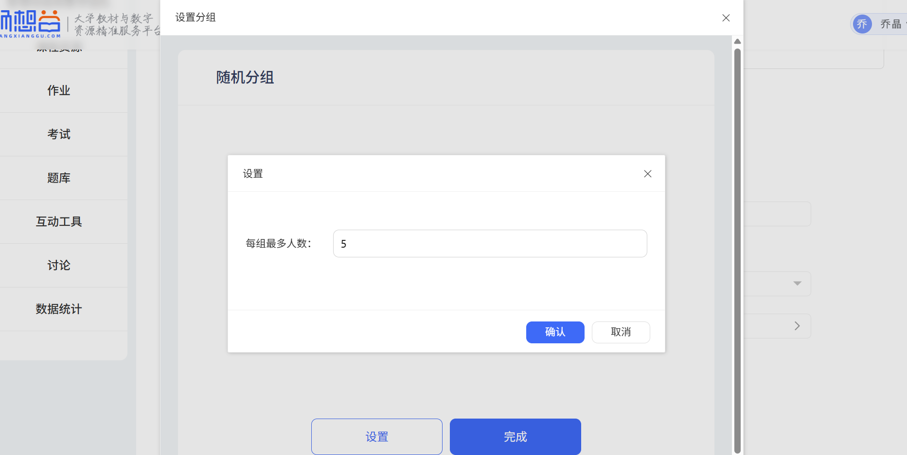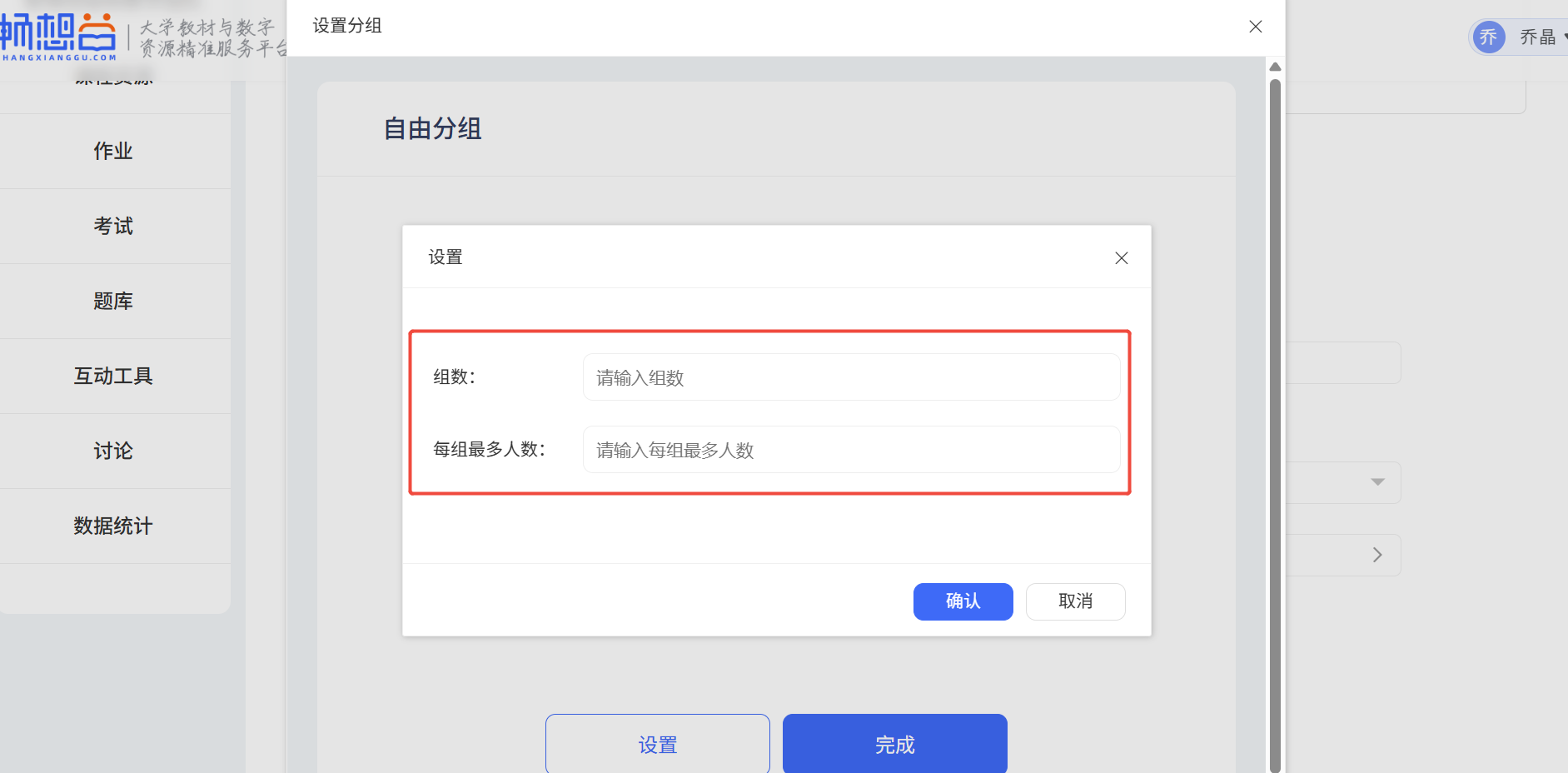 (2)自由分组需设置组数和每组最多人数,需学生自由加入分组,超过每组最大人数后,学生不可加入该组