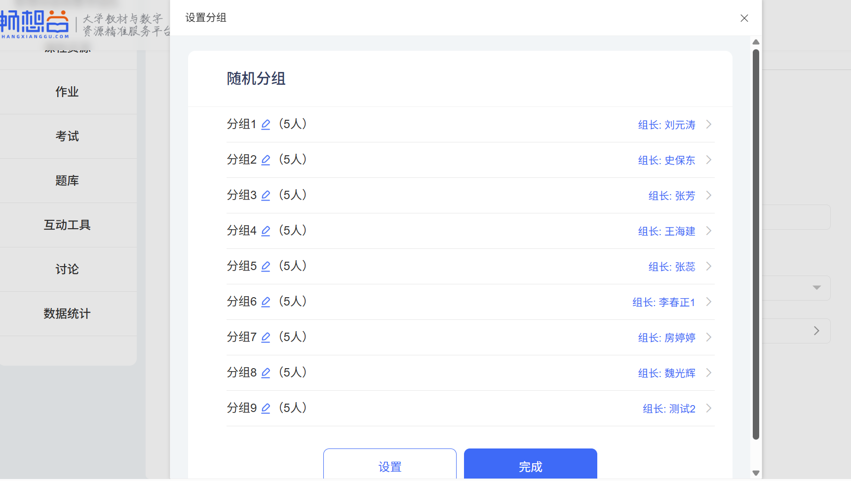 (1)随机分组需设置每组最多人数,分组后可设置每组组长