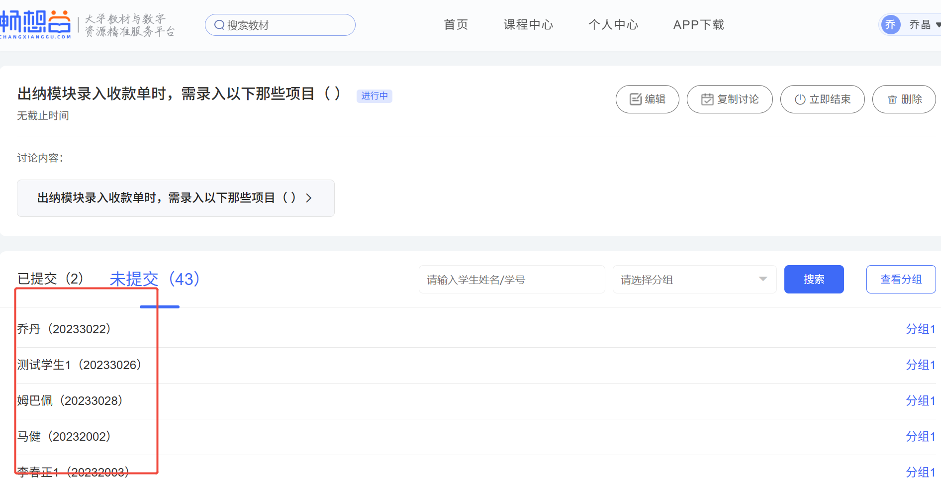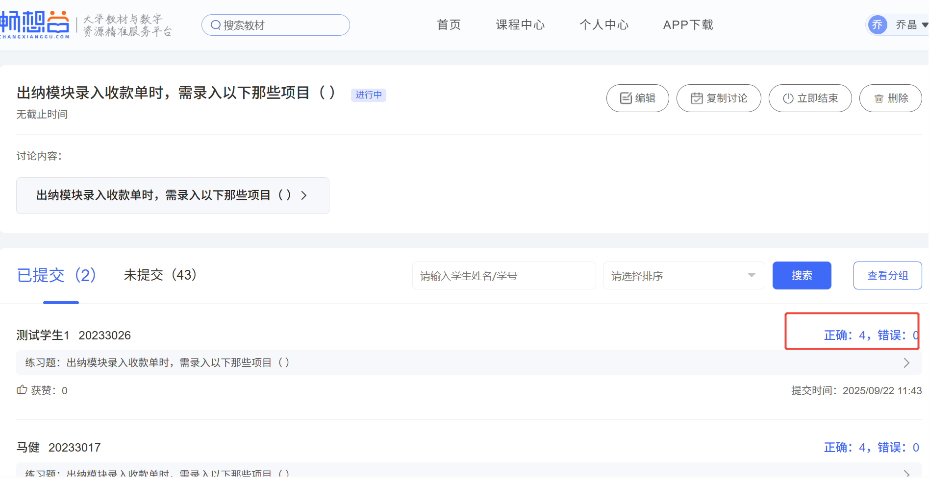 老师可查看该讨论的提交和未提交情况,如为分组讨论时可查看分组,并设置组长;讨论的课后题系统会根据题型自动自动判断对错,老师可对主观题进行评分,可查看学生点赞情况;